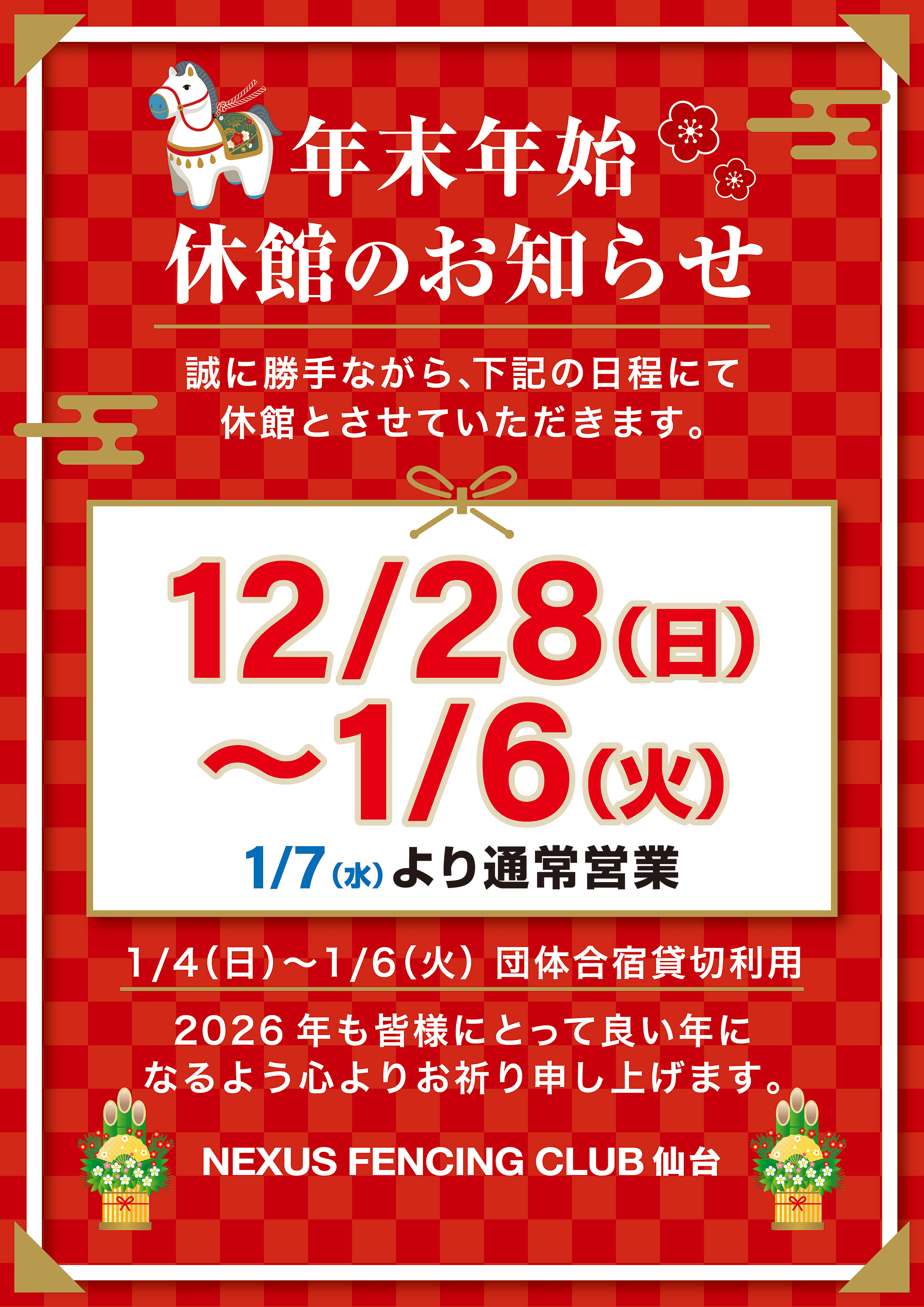 TOP 年末年始休館のお知らせ | NEXUSフェンシングクラブ仙台 | 宮城県仙台市宮城野区 年末年始休館の… | NEXUSフェンシングクラブ仙台 | 宮城県仙台市宮城野区 年末年始休館のお知らせ Warning: Undefined variable $count in /home/c3150827/public_html/nexusfencing-sendai.com/wp-content/themes/temp/single.php on line 143 2025.12.18 年末年始休館のお知らせ 一覧へ